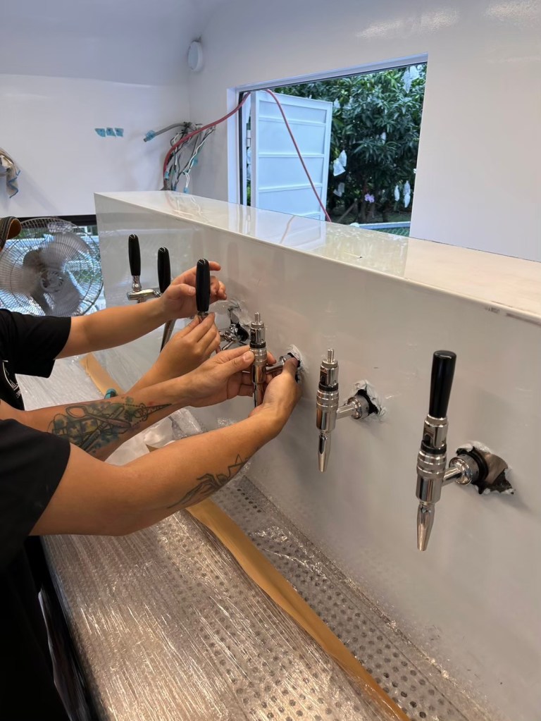 相當有想法的客人,將露營用拖車進行改裝,搭配上生啤酒設備以及其他餐飲設備後變成一台可以行走的大型餐車。