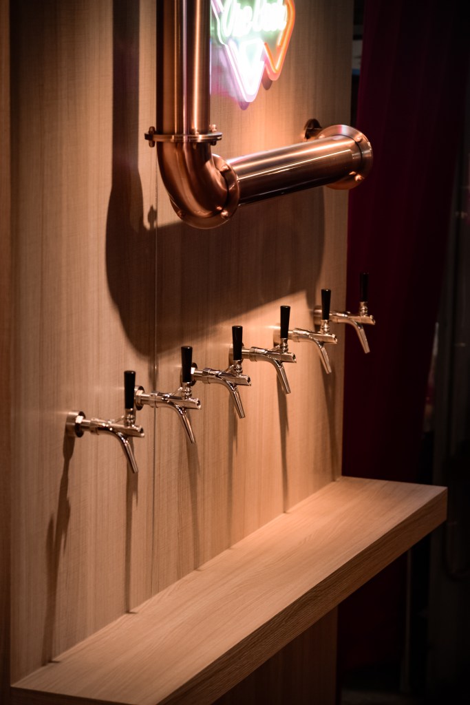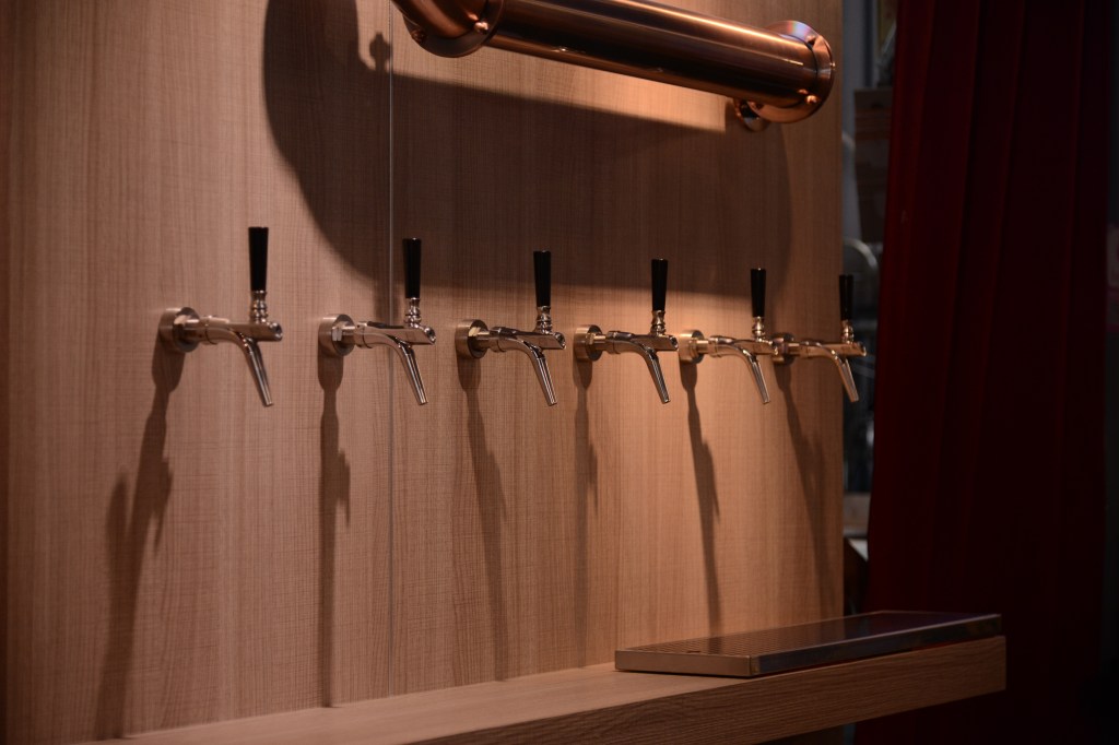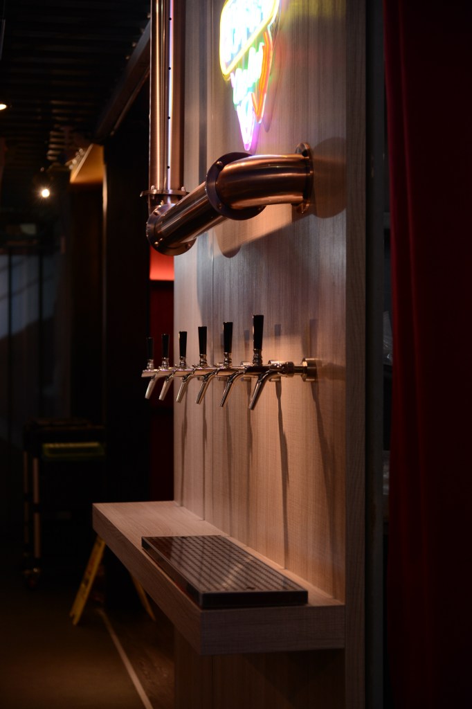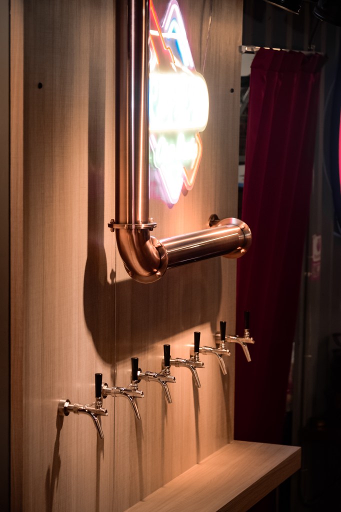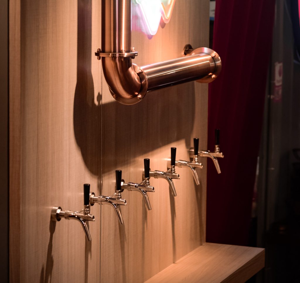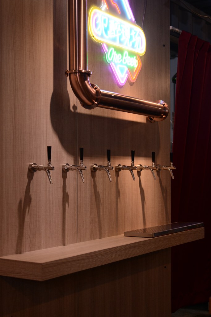 這套牆面式生啤酒設備採用六管生啤酒龍頭搭配造型裝飾酒柱,巧妙地安裝於牆面上。啤酒桶存放於冷藏冰箱內,並將冰箱主體隱藏於背牆後方,確保前端視覺僅呈現美觀的酒柱與龍頭。這樣的設計不僅提升空間質感與整體美觀度,還能為客人帶來更純粹的用餐與品飲體驗。