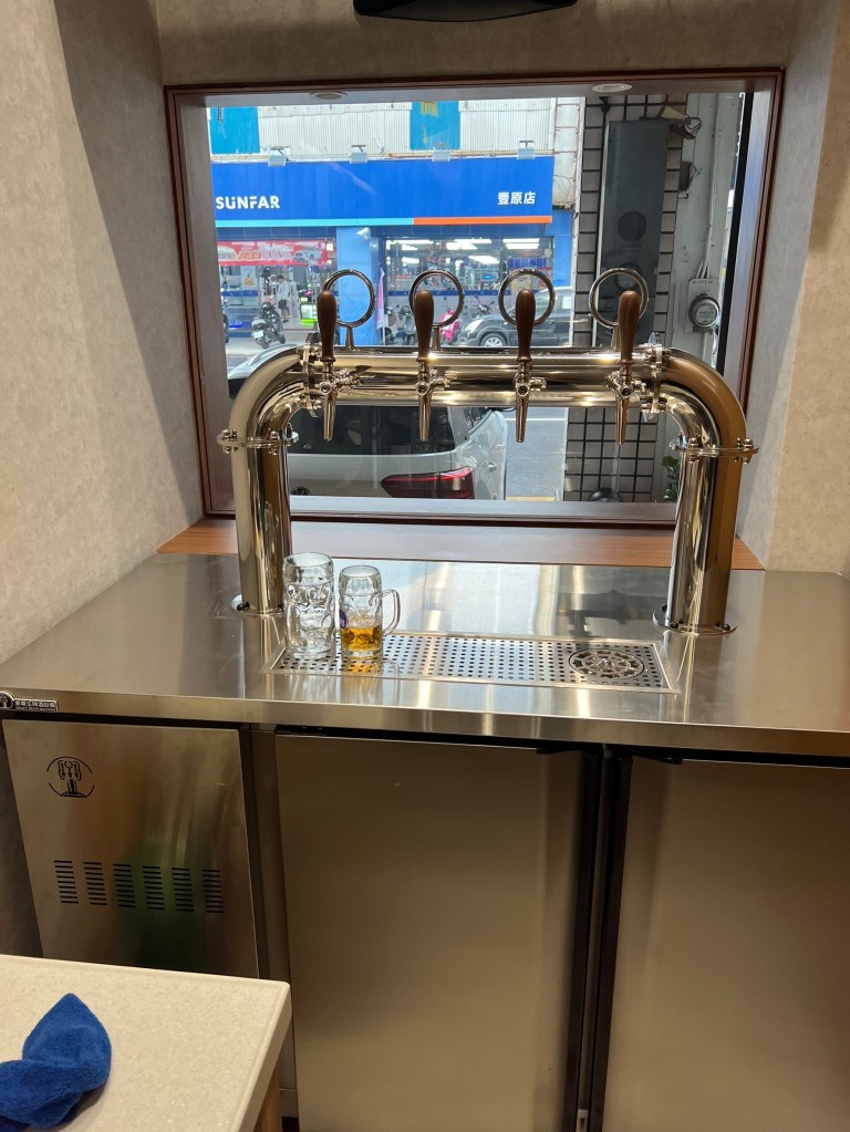 位於台中市豐原區中正路的店家,安裝了五尺低溫冷藏冰箱搭配拱門型四管生啤酒酒柱,並配有洗/冰杯器,確保啤酒口感穩定。